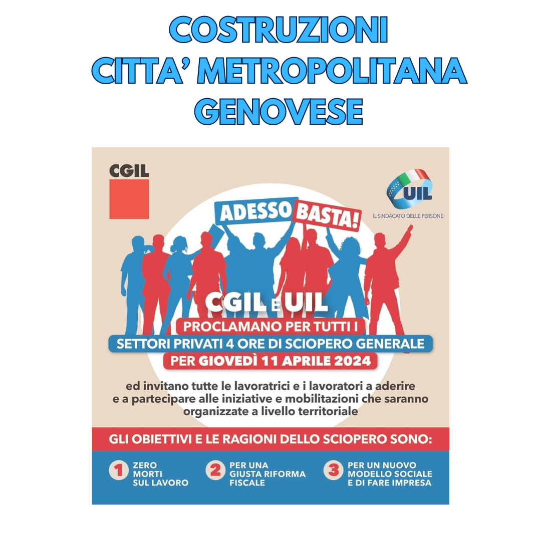 Si terrà giovedì 11 aprile lo sciopero nazionale proclamato da Cgil e Uil per chiedere sicurezza sul lavoro. I lavoratori delle costruzioni della città metropolitana di Genova si fermeranno per 8 ore: “I dati degli infortuni sul lavoro, purtroppo anche mortali, continuano ad essere altissimi e dietro ad ogni numero ci sono donne e uomini