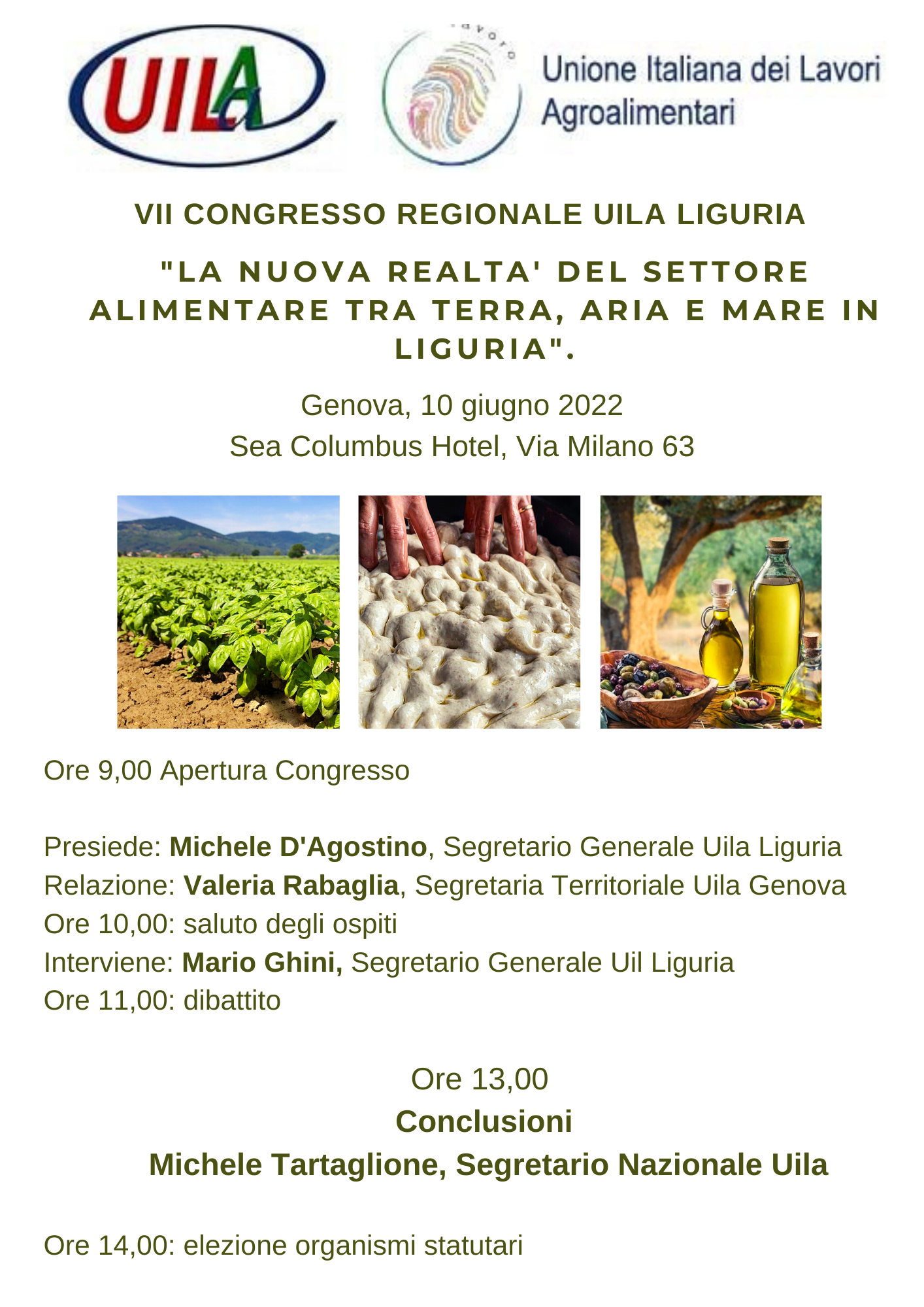 Si volgerà a Genova il 10 giugno 2022 alle ore 9,00 il VII Congresso regionale della Uil Liguria: “La nuova realtà del settore alimentare tra terra, aria e mare in Liguria”. Parteciperanno: il segretario organizzativo Uila Guido Majarone, il segretario generale della Uil Liguria Mario Ghini, il segretario generale Uila Liguria Michele D’Agostino, la segretaria