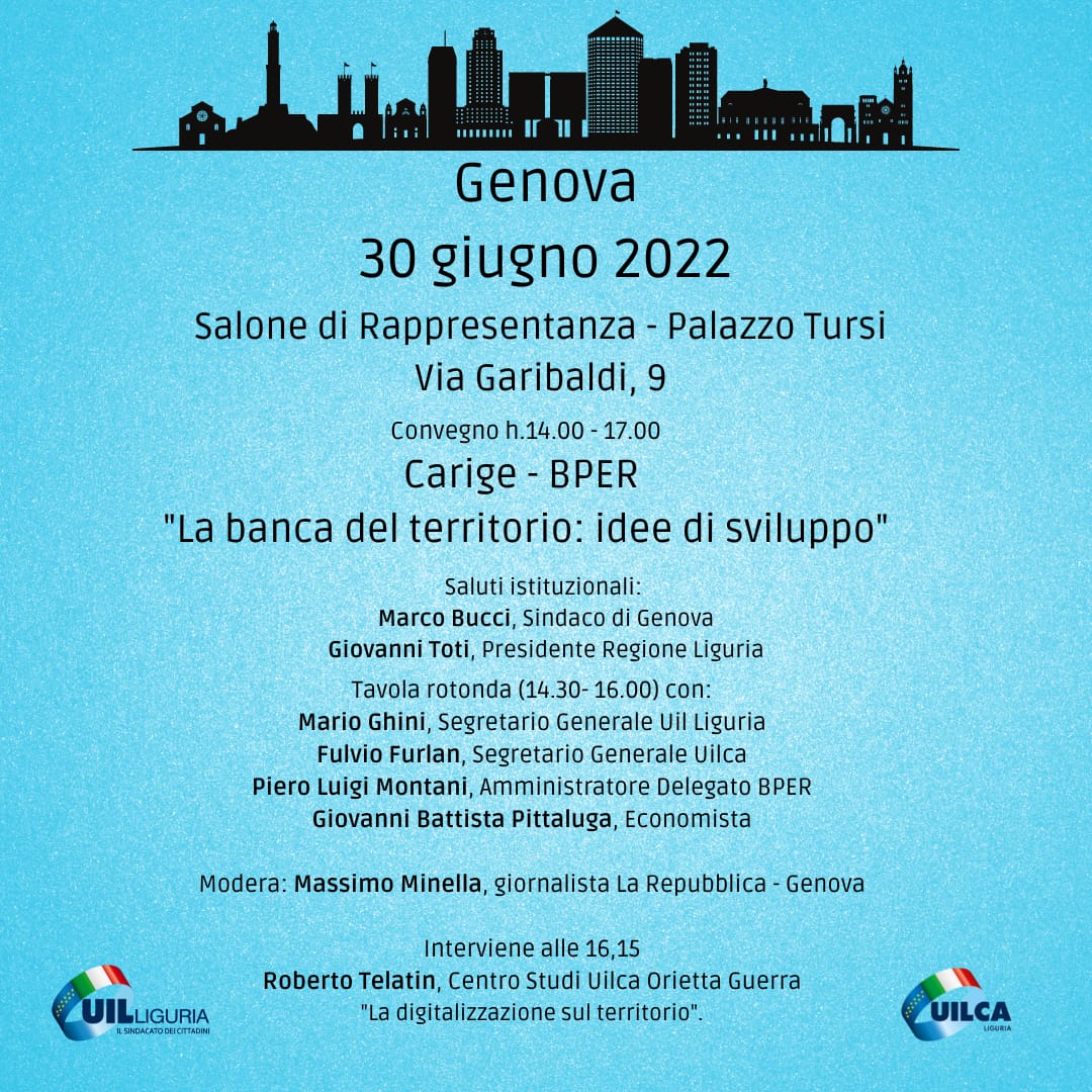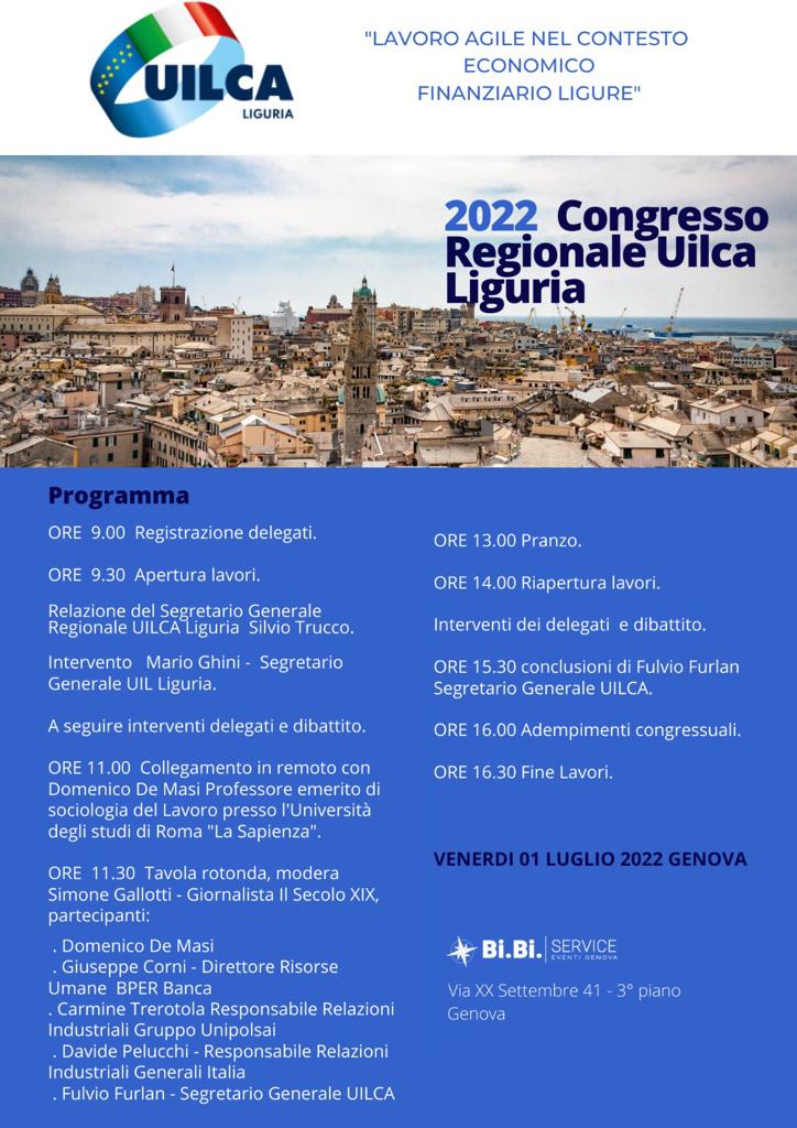Si svolgerà il 1 luglio presso il Bi.Bi. Service di Genova (via XX Settembre, 41 – 3° piano) a partire dalle 9.30 il congresso regionale della Uilca Liguria. Saranno presenti il segretario generale nazionale Fulvio Furlan e il segretario generale della Uil Liguria Mario Ghini. All’interno dei lavori è compresa una tavola rotonda sulle principali