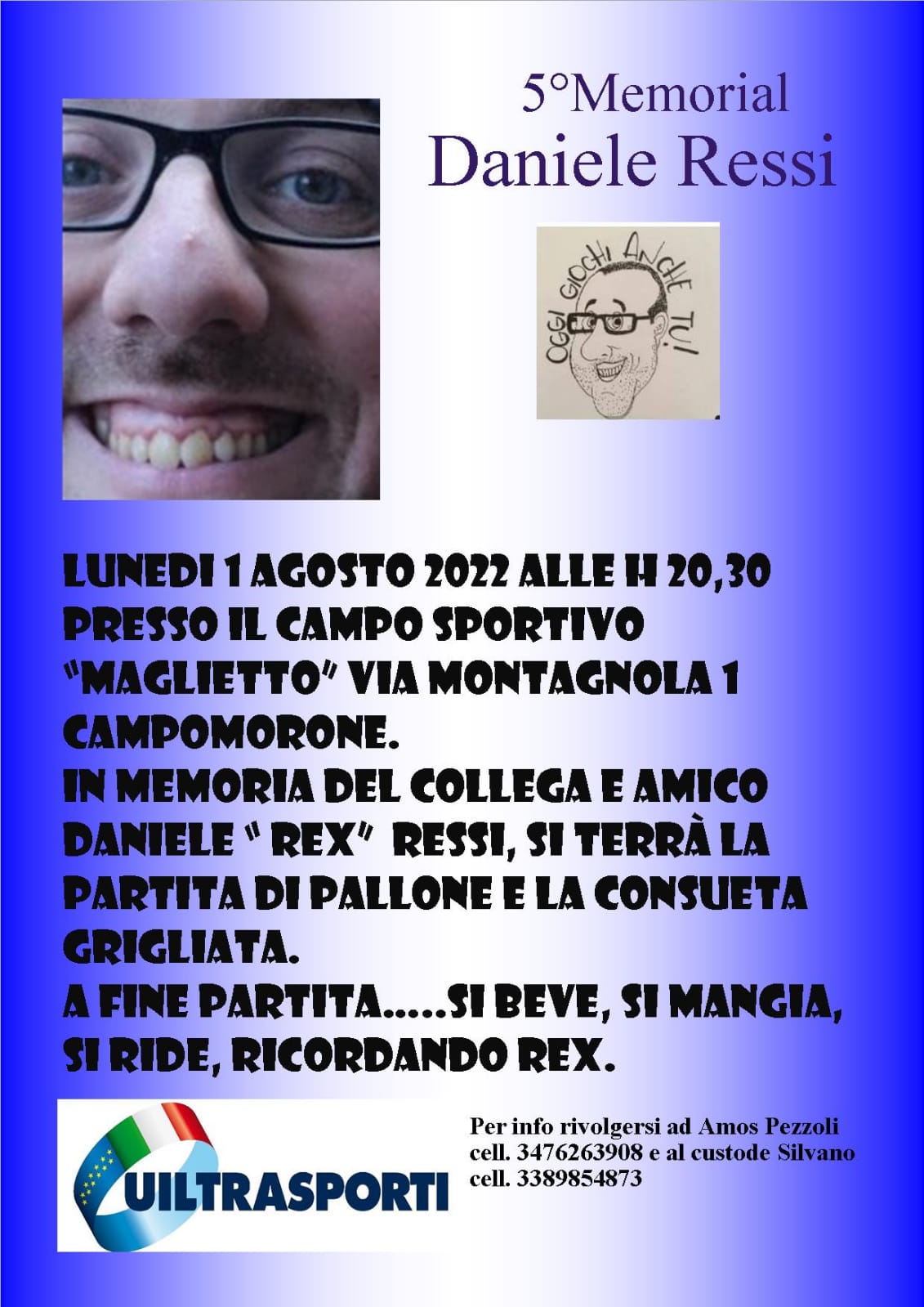 Il Memorial Daniele “Rex” Ressi, organizzato dalla Uiltrasporti e dagli amici, arriva alla 5° edizione. A Campomorone, presso il campo sportivo “MAGLIETTO” in via Montagnola 1, si terrà “la partita di pallone” in memoria del collega e amico. A fine partita si beve, si mangia e si ride ricordando Rex.