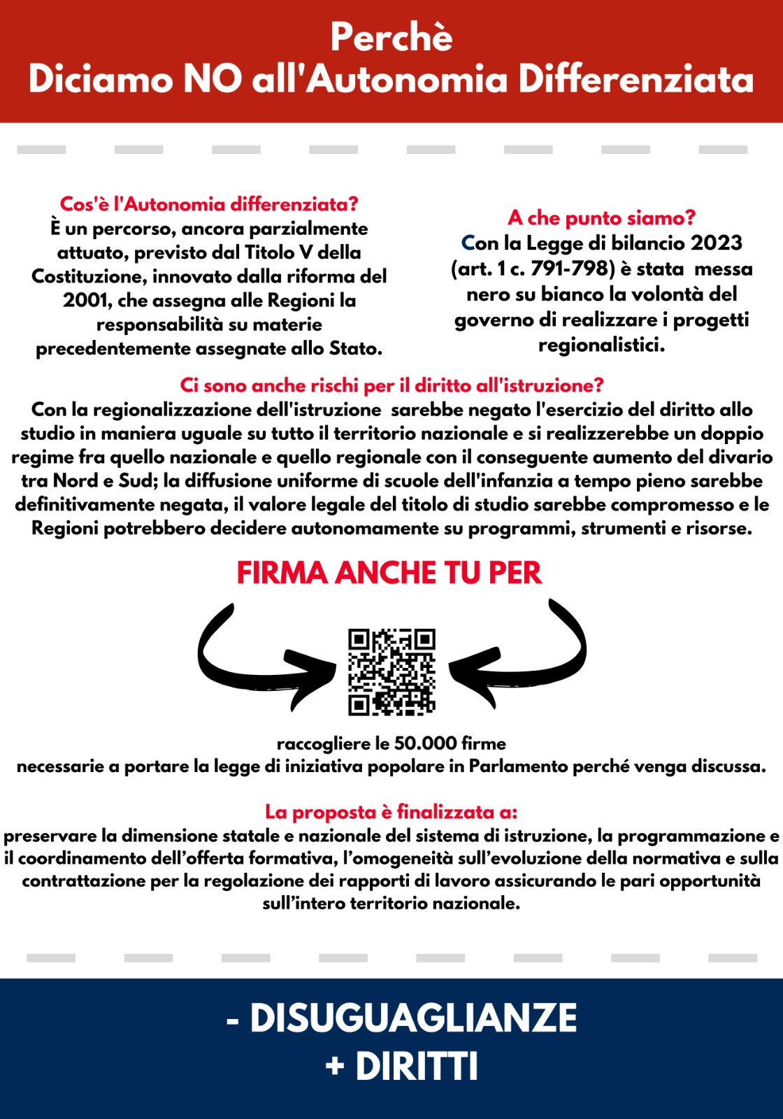 A sostegno di questa mobilitazione è inoltre in corso una raccolta firme che ha lo scopo di preservare il sistema pubblico scolastico, coinvolgendo studenti, lavoratrici, lavoratori e la cittadinanza tutta. Lo scopo è di raggiungere le 50 mila firme necessarie a portare in Parlamento una legge di iniziativa popolare che miri a tutelare la dimensione statale e nazionale del sistema di istruzione, la programmazione e il coordinamento dell’offerta formativa, l’omogeneità sull’evoluzione della normativa e sulla contrattazione per la regolazione dei rapporti di lavoro assicurando le pari opportunità sull’intero territorio nazionale.