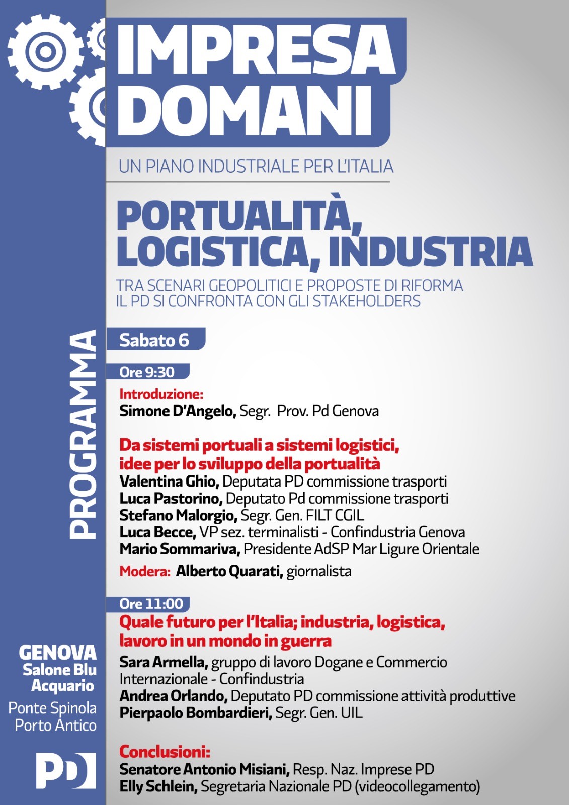 Sabato 6 aprile il segretario generale della UIL PierPaolo Bombardieri sarà a Genova all’iniziativa organizzata dal Partito Democratico: “Impresa domani. Un piano Industriale per l’Italia: portualità, logistica, industria”, che si svolgerà, a partire dalle 9,30, al Salone Blu dell’Acquario di Genova presso Ponte Spinola al Porto Antico.