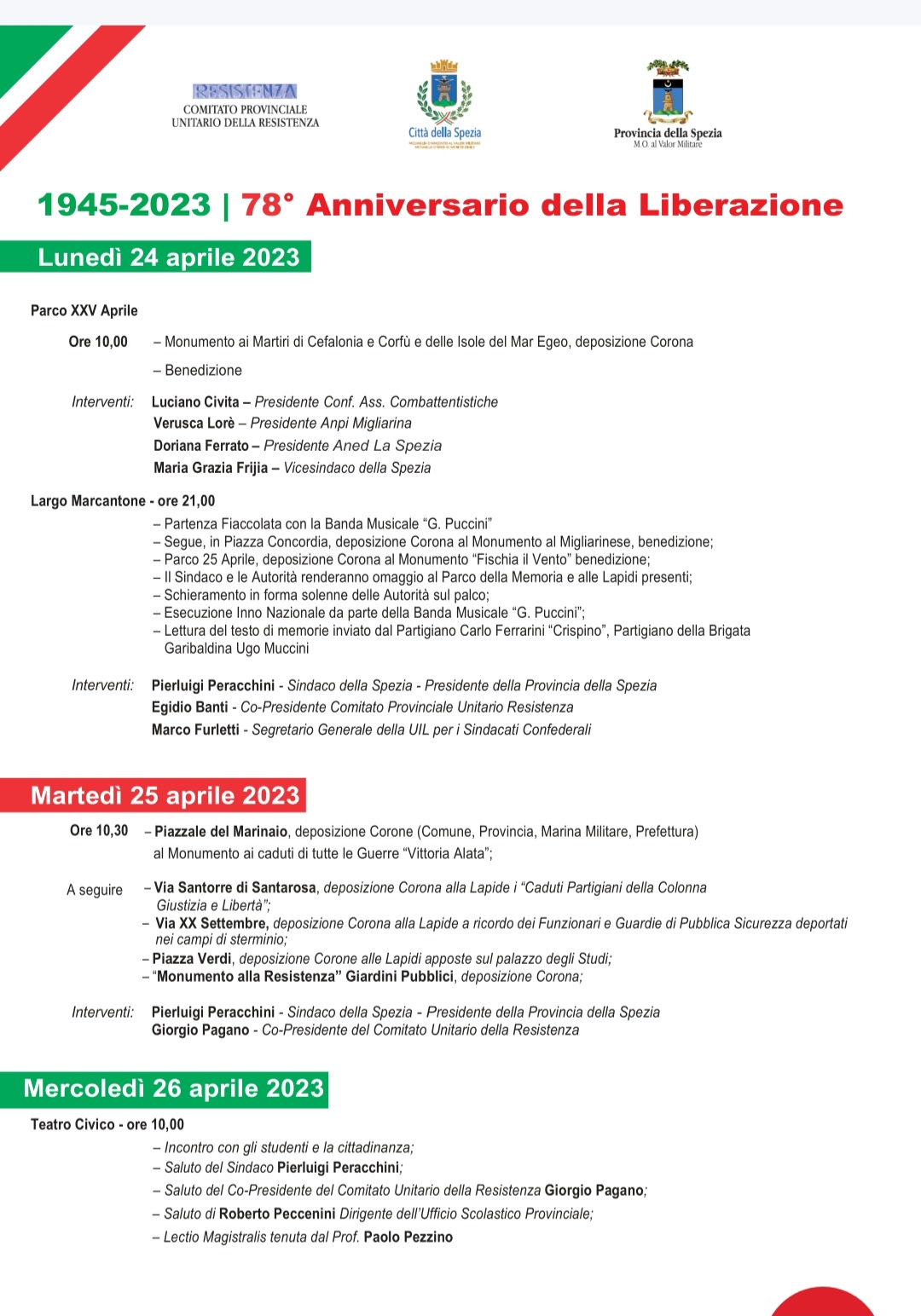 24/4 Le celebrazioni avranno inizio lunedì 24 aprile alle ore 10,00 presso il parco XXV Aprile, proseguiranno in Largo Marcantone alle ore 21,00 (fiaccolata, deposizione corone, omaggio al parco della Memoria); interverrà il segretario regionale Uil Liguria Marco Furletti.