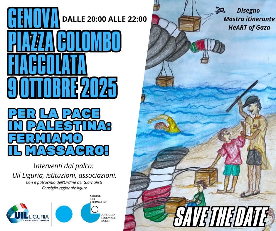 Il prossimo 9 ottobre, dalle 20:00 alle 22:00, si terrà in piazza Colombo, a Genova, un’iniziativa di solidarietà in favore del popolo palestinese: