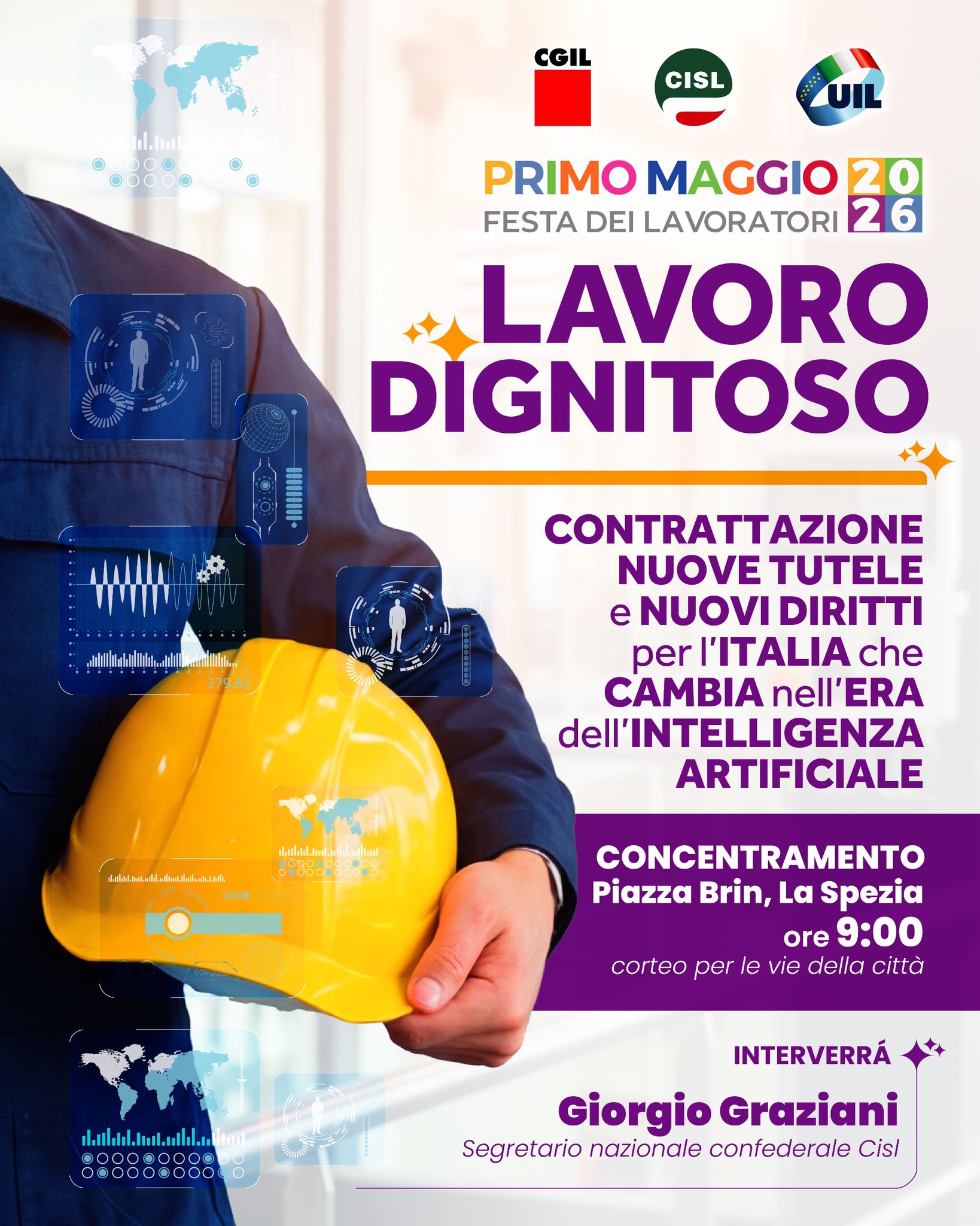 “Contrattazione, nuove tutele, nuovi diritti per l’Italia che cambia nell’era dell’intelligenza artificiale” è il tema che Cgil, Cisl e Uil hanno dato a questo Primo Maggio. A Savona si terrà, a partire dalle ore 10:00, il comizio unitario in piazza Sisto IV a cura di Santo Biondo, segretario nazionale UIL. A seguire si terrà il tradizionale corteo che si snoderà per le vie cittadine fino ad arrivare in Piazza Mameli dove, al rintocco della campana, verrà deposta una corona d’alloro in memoria dei martiri del lavoro.