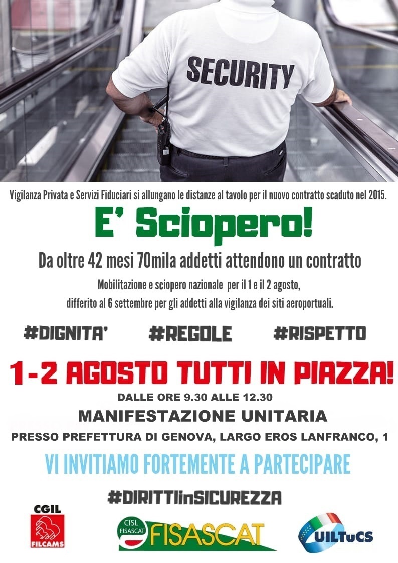 Le OO.SS Filcams-Cgil, Fisascat-Cisl e Uiltucs-Uil nazionali hanno nuovamente indetto uno sciopero nazionale in risposta alle richieste avanzate dalle associazioni datoriali di categoria, emerse nel corso di numerosi incontri avvenuti in questo periodo di profonda incertezza per il settore della vigilanza privata sul rinnovo del contratto collettivo nazionale di lavoro scaduto il 31 dicembre 2015, che sembrano voler riportare 60 anni indietro i lavoratori su temi fondamentali come quello della sicurezza, dell’orario di lavoro, malattia e molto altro ancora. A Genova si svolgerà un presidio sia il 1° che il 2 agosto davanti alla prefettura il largo Lanfranco, dalle ore 9.30 alle ore 12.30.