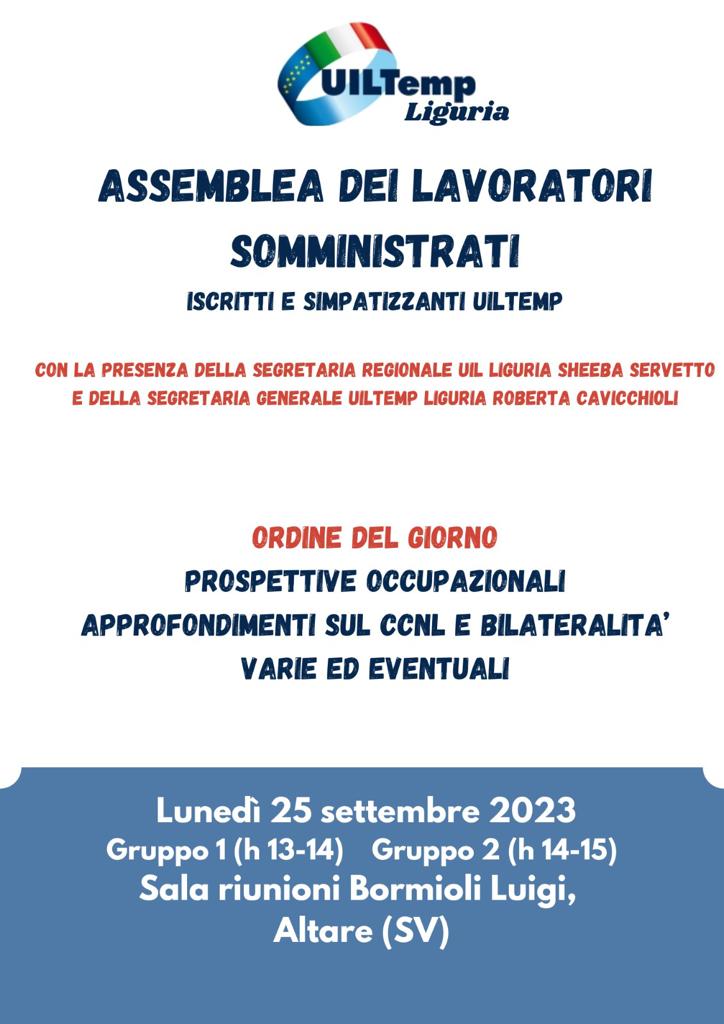 Si svolgerà ad Altare lunedì 25 settembre l’assemblea delle lavoratrici e dei lavoratori somministrati iscritti e simpatizzanti Uiltemp Liguria presso la sala riunioni Bormioli Luigi.