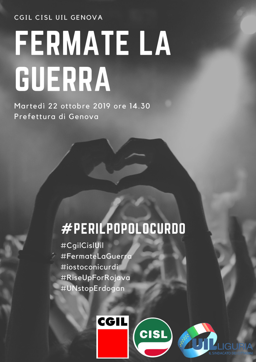 Cgil Cisl Uil fanno un appello al Governo e a tutta la comunità internazionale, in primis all’Unione Europea, per rivedere gli accordi con la Turchia e farsi parte attiva nella ricerca di una soluzione pacifica. Per questo motivo martedì 22 ottobre a partire dalle ore 14.30 saranno in presidio davanti alla prefettura di Genova in largo Lanfranco 1.